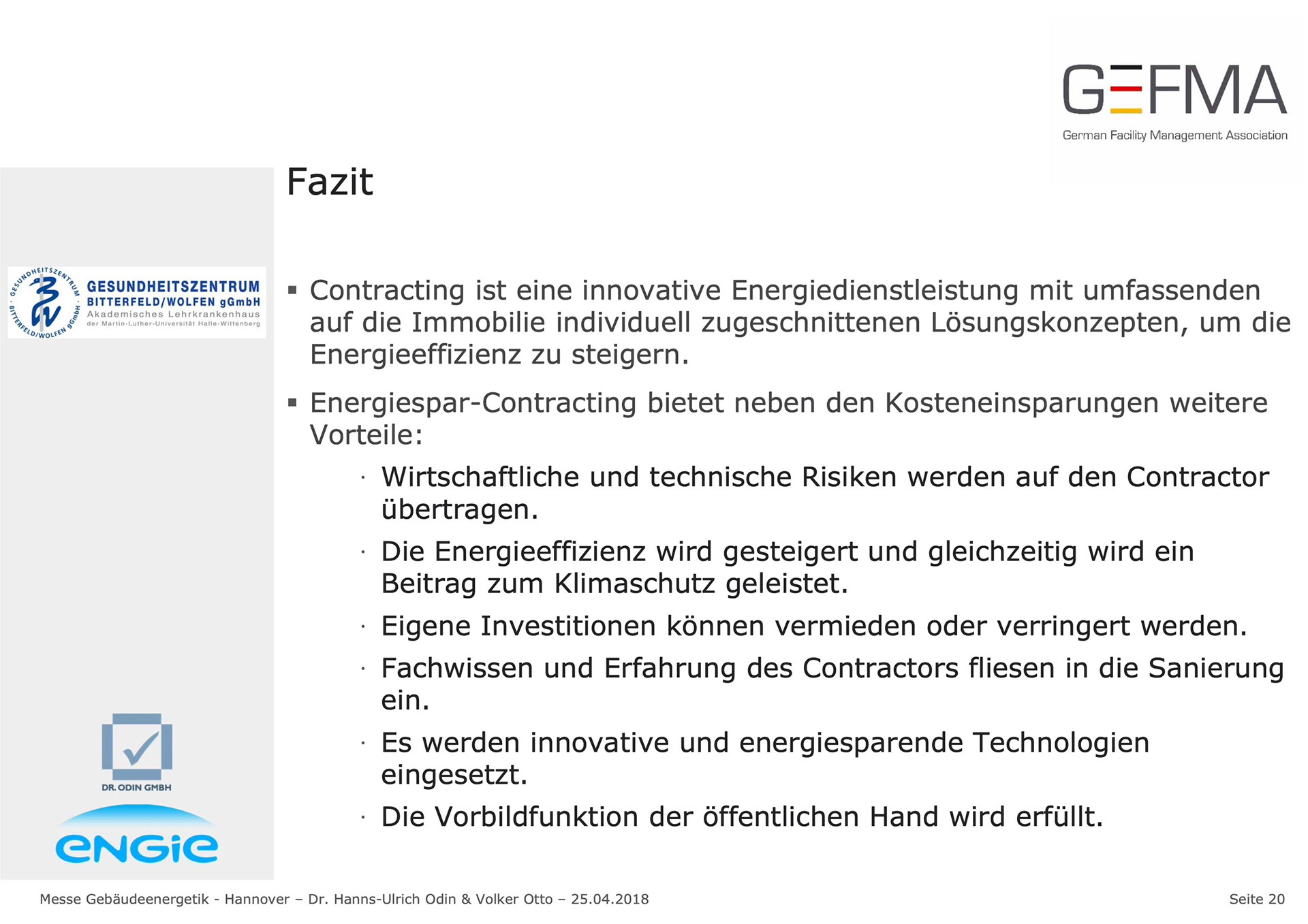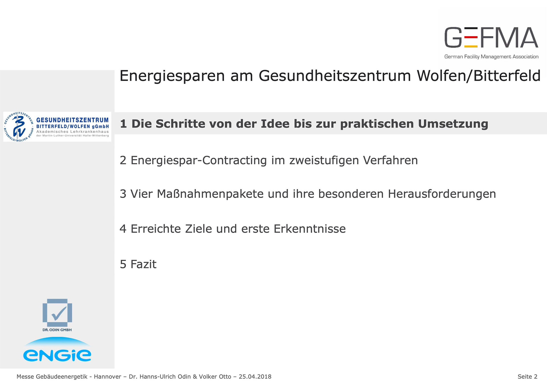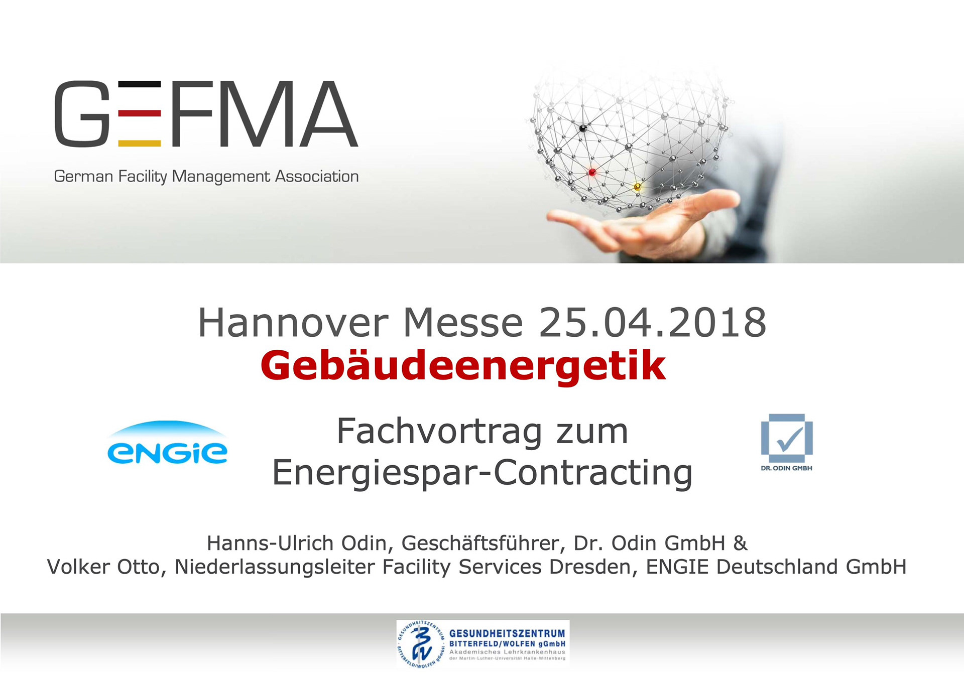 Hannover Messe 25.04.2018 Gebäudeenergetik Fachvortrag zum Energiespar-Contracting Hanns-Ulrich Odin, Geschäftsführer, Dr. Odin GmbH & Volker Otto, Niederlassungsleiter Facility Services Dresden, ENGIE Deutschland GmbH